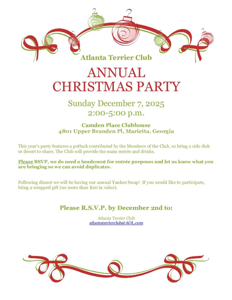 THE ATLANTA TERRIER CLUB Invites You to Our Terrier SpecialtyShow Wednesday, March 25, 2026 Held in conjunction with the Lake Lanier Cluster, with following all-breed shows, Thursday 3/26 thru Sunday 3/29 Gwinnett County Fairgrounds 2405 Sugarloaf Parkway, Lawrenceville, Georgia TERRIER SPECIALTY FEATURES Two Group Shows – One Day! • Back-to-Back Shows, indoors • Judges: Lorraine […]